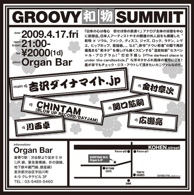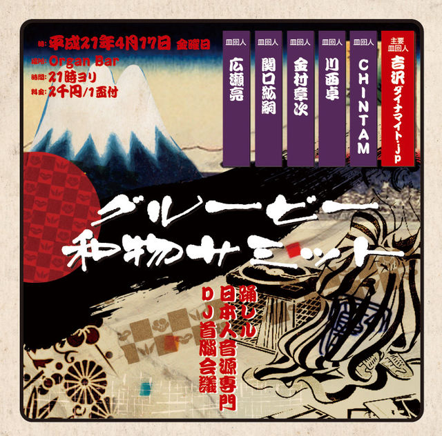 「日本の心は母心 回せば命の泉湧く」アナログ主体の旧譜を中心に新譜迄。日本人アーティストやその関連の外人皿をも網羅した"和物 × ソウル、ファンク、ディスコ、ジャズ、ロック、ラテン、レゲエ、ヒップホップ、歌謡曲、、、など”。昨今”ナウい若者”の間で再評価高まる”和ネタ”を惜しげも無くスピンする”温故知新”なスペシャル・プログラム!”灯台下暗し(=The darkest place is under the candlestick.)”な洋ネタかぶれ気味の貴方にこそ!是が非でもチェック・ジス・アウトして頂きたいカニヴァルなのだ。