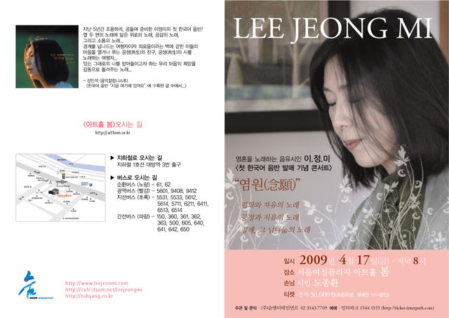 東京生まれの在日コリアン歌手、李政美(い・ちょんみ)さんが、ソウルで公演を行います。日本語で歌っても韓国語で歌っても、同じしなやかさと強さを表現することのできる歌手、李政美さん。この公演は、最近出された韓国語版CD「@지금 여기에 있어요(イマココニイルヨ)」の発売を記念したものです。