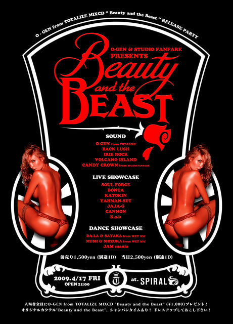 O-GEN & STUDIO FANFARE PRESENTS "Beauty and the Beast" O-GEN from TOTALIZE MIXCD "Beauty and the Beast" RELEASE PARTY!! 2009.4.17.FRI at SPIRAL OPEN : 21:00 前売り 1,500yen (別途1D) / 当日 2,500yen (別途1D) 入場者全員にO-GEN from TOTALIZE MIXCD "Beauty and the Beast" (\1,000)プレゼント!! オリジナルカクテル"Beauty and the Beast"、シャンパンタイムあり!! ドレスアップしておこし下さい!! □SOUND O-GEN from TOTALIZE BACK LUSH / IRIE ROCK / VOLCANO ISLAND / CANDY CROWN from S