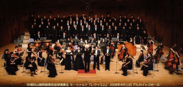 尼崎フロイデ合唱団というのがJR尼崎駅北側にある小田公民館というところで練習を続けています。 尼崎フロイデ合唱団は2008年春にJR福知山線脱線事故を追悼するための演奏会を行いました。 この追悼演奏会の再演をとのご希望もたくさんいただいたこともありましたので 来2009年の4月にも第2回目の追悼演奏会を開催することになったのですが、その演奏会のためにはまだまだ合唱団員が不足してるのが現状です。 そこで私たちの合唱団は、今私たちと一緒に歌って下さる団員を大募集いたしております。 曲目は前回と同じく モ