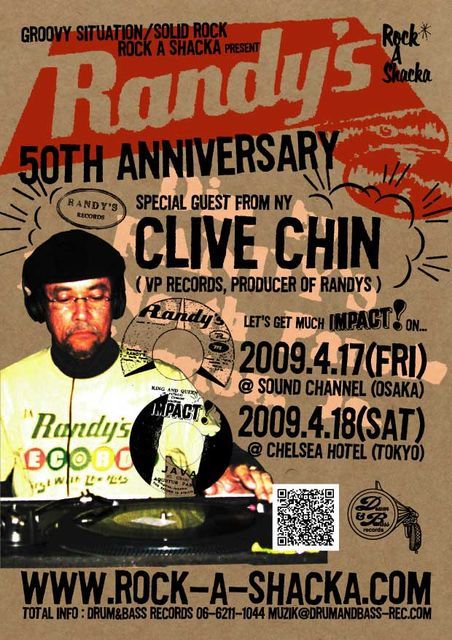 Groovy Situation/Solid Rock/Rock A Shack presents [ Randy's 50th Aniversary ] ジャマイカ音楽史を語る上で欠く事のできないレーベル「RANDYS」(現 VP Records)のプロデューサー、CLIVE CHINがレーベル設立50周年を記念し、この春、初の来日を果たす。各会場にて、来日記念盤Randys 45 Limited Reissueを先行販売予定。 詳しくは下記URLにて >> http://www.rock-a-shacka.com/randys/ 4月17日(金)大阪 Sound Channel http://www.sound-channel.jp 4月18日(土)東京 Chelsea Hotel http://www.chelseahotel.jp 出演 Clive Chin
