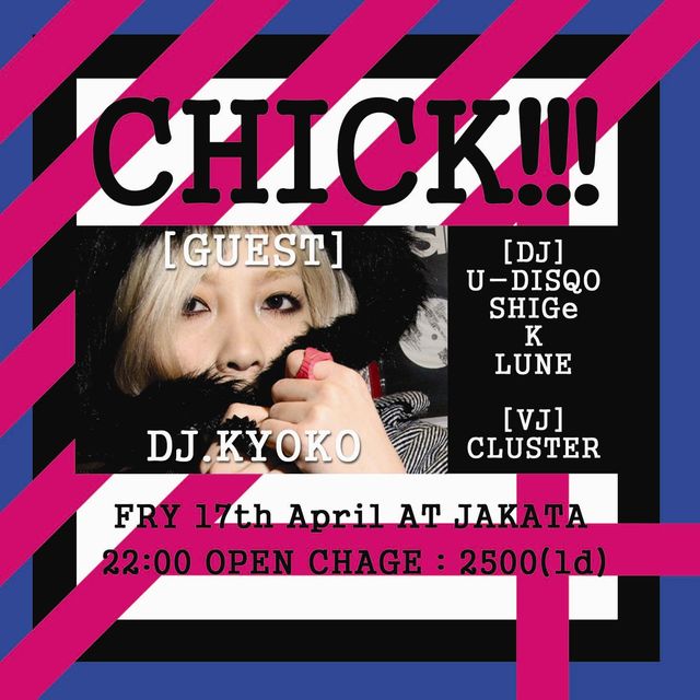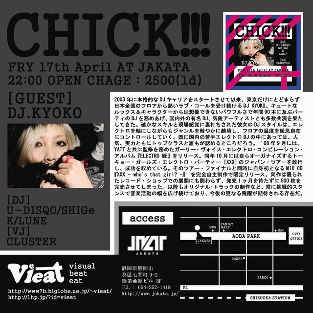 2009.04.17(FRI) 「Vieat presents」 CHICK!!!@JAKATA http://www7b.biglobe.ne.jp/~vieat/ PLACE:JAKATA 静岡県静岡市葵区七間町9-2 紙業会館 BFTEL 054-252-1418 http://www.jakata.jp/ OPEN:22:00 CHARGE:¥2500(1drink) GUEST DJ:DJ KYOKO(XXX) DJ:U-DISQO(Vieat)/SHIGe(NIZI)/K(FACT)LUNE(aorii+kaedee) VJ:CLUSTER(Vieat) LIGHTING:煌 DJ+VJユニット「Vieat」が静岡のクラブシーンに放つエレクトロパーティー! 2008年9月の開催から半年。再び、ゲストDJにDJ KYOKOを迎え開催が決定!