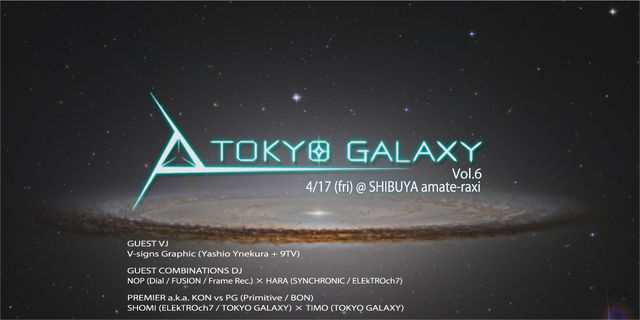 管理人様告知失礼致します。 4/17(fri) @ 渋谷amate-raxi DOOR \2500 WF \2000 OPEN/START 23:00 TOKYO GALAXY vol.6 THREE SETS OF COMBINATIONS DJ GUEST VJ V-signs Graphic (Yashio Yonekura + 9TV) GUEST COMBINATIONS DJ NOP (Dial / FUSION / Frame Rec.) × HARA (SYNCHRONIC / ELEKTROch7) SHOMI (ELEkTROch7 / TOKYO GALAXY) × TIMO (TOKYO GALAXY) PREMIER a.k.a. KON vs PG (Primitive / Bon) DECO POLYHEDORON lounge DJ aa (CUBIC LOOP) OKAZU (JUNGLE POCKET) ACHO (CACTUS /