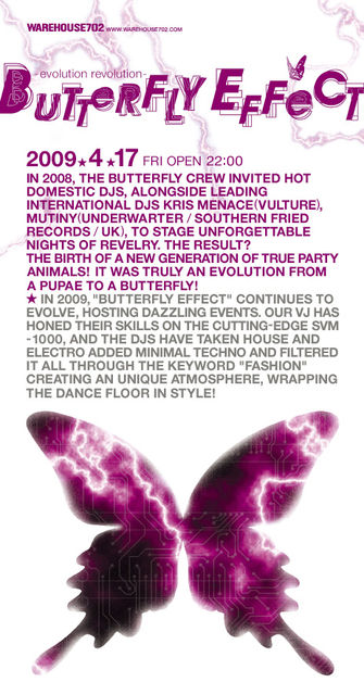 2009年第二弾はTOKYO No.1 SOUL SETの屋台骨を支えるトラックメイカーであり、石野卓球とのユニット“InK”でも知られる川辺ヒロシ、AYASHIGE+Bryan Burton-Lewisの二人によるハイパーダンスユニットBRASHIGEの2組をゲストに迎え、パーティーモンスターと化したRESIDENT陣がエヴァンジェリストとなり体現する、ギラギラした夜に期待して欲しい。 ButterflyEffect-evolution revolution- 【HOUSE/ELECTRO/TECHNO】 http://www.warehouse702.com/schedule/sche090417.html 2009年4月17日(金) OPEN:22:00 DOOR:3500yen w/f:3000yen PLACE: