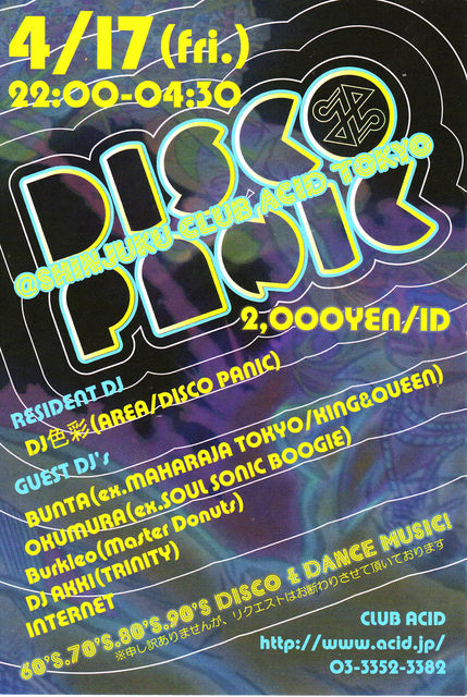 ヤバいですあせあせ(飛び散る汗) 新年度早々私BurkleoなんかにとんでもないDJブッキングがやってきました!! DISCO PANIC! もうタイトル通りの狂乱フロア必至ですexclamation ×2 DJ陣の紹介です。 【RESIDENT DJ】 DJ色彩(AREA/DISCO PANIC) http://mixi.jp/show_friend.pl?id=8583558 平成生まれ昭和育ちのキャッチコピーと、ジャンルを横断するプレイを武器に、様々なスタイルのクラブでプレイ。 DISCO PANICオーガナイザー。 【思い出の一曲】 Touch Me/49Ers 【GUEST DJ'S】 るんるんBunta(ex.MAHARAJA TOKYO.KING&QUEEN)
