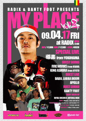 4/17(金) RADIX & BANTY FOOT presents 『MY PLACE vol.2』 at RADIX 【SPECIAL LIVE】 導楽(from YOKOHAMA) APOLLO(from OSAKA) DADA(from NARA) LABBA BOOM(from OSAKA) 【GUEST SOUND】 FIRE WORKS(from OSAKA) KING ASHURA(from KYOTO) 【HOST SOUND】 BANTY FOOT 【EARLY WARM UP】 ROYAL BREDREN NATURAL HIGH OPEN 22:00 ADV 2000YEN ADM 2500YEN ※入場時に別途1D必要 [Info] RADIX 052-332-0073 前回、大好評だった「MY PLACE」。 2回目となる今回は、ヤングジェネレーションにスポッ