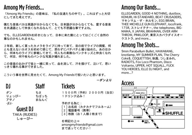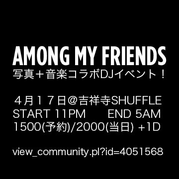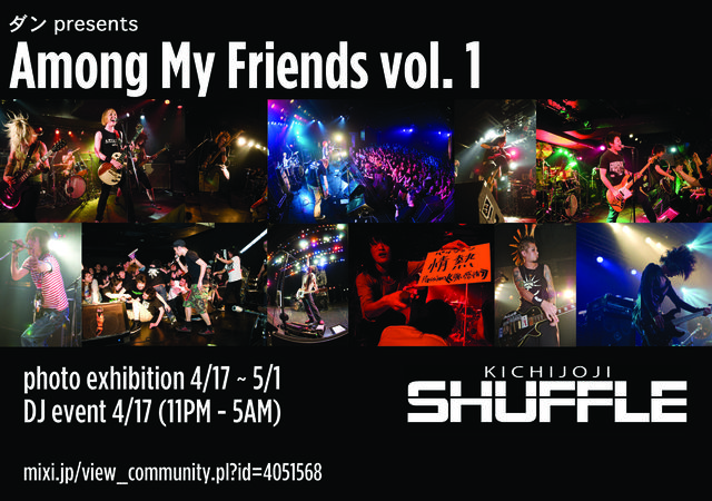 こんばんは!エルレDJナイト、SHAKE YOUR BRAIN、様々他のイベントのカメラマン ダンです! 皆はご存知かも知れないんですが、4月17日から、吉祥寺SHUFFLEというライブハウスで写真展を行って、開幕日の夜に記念DJイベントもさせていただきます! 自分の写真を見せたり、熱いDJ組のセットリストを聴いたり、皆と遊んだりするのは楽しみので、是非びに来てください! 【Among My Friends vol. 1】 日時:4月17日(金) 場所:吉祥寺 SHUFFLE (http://www.k-shuffle.com) TICKET: 1500円(予約)2000円(当日)1ドリンク込み