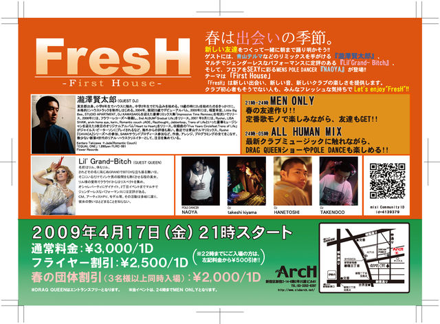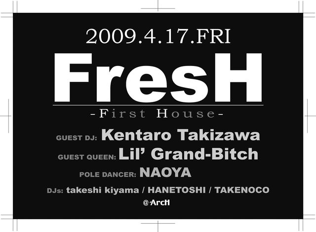 管理人様、告知失礼致します。 春の友達作り!! 出会い・音楽・ダンスパフォーマンス・ショータイム... すべてがここにある!! ■■ FresH -First House- ■■ 春は出会いの季節。 新しい友達をつくって一緒に朝まで踊り明かそう!! ゲストには、青山テルマなどのリミックスを手がける『瀧澤賢太郎』、 マルチでジェンダーレスなパフォーマンスに定評のある『Lil'Grand- Bitch』、 そして、フロアをSEXYに彩るMENS POLE DANCER『NAOYA』が登場!! テーマは「First House」 「FresH」は新しい出会い、新しい音、新しいクラブの楽しさを提供