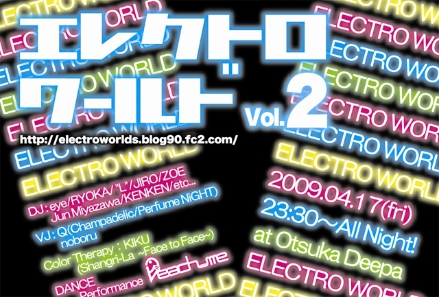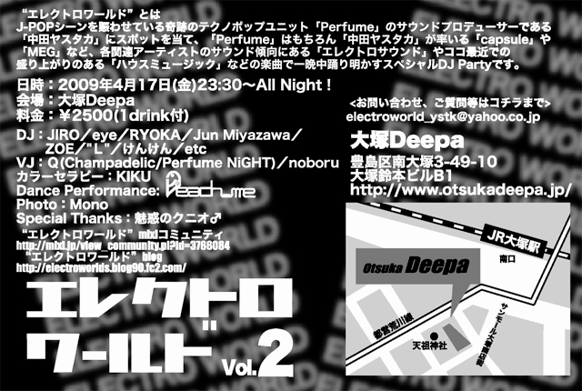 管理人様、イベント告知失礼いたします。 皆さんこんばんわ。 イベント「エレクトロワールド」主催のけんけんと申します。 この度、会場を大きくして第2回を開催することが決定しました! capsule好きの女性DJがなんと4人集まってます! 広い会場でみんなで楽しく踊りませんか? “エレクトロワールド Vol.2” 日時:4/17(金)23:30〜All Night! 会場:大塚 Deepa 03-3984-6085 住所:豊島区南大塚3-49-10大塚鈴本ビルB1 http://www.otsukadeepa.jp/ 料金:¥2500(1d付) DJ:JIRO/eye/RYOKA/Jun Miyazawa/"L"/ZOE/けん