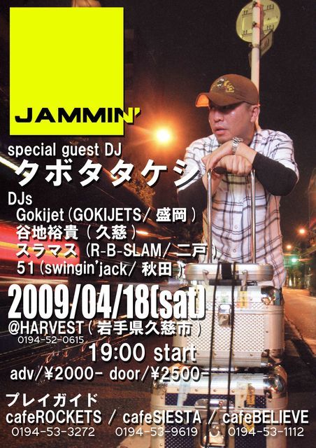 4/18 @HARVEST 19:00start special guest: クボタタケシ http://www.skylarkin.com/kubota.html 51(Swingin' jack/akita) yati’n gokijet(gokijets) スラマス(R−B−SLAM) http://gokijets.seesaa.net/ http://www.r-b-slam.com/ ad:2000yen door:2500yen (チケット前売り開始は後日発表) 数にもかぎりがあるので定数に達し次第、売り切れとさせていただきます。 そのほかの詳細は決まり次第随時また告知します。