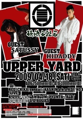 open/start 21:00- ADV \2500/1D DOOR \3000/1D <GUEST LIVE> SATUSSY HIDADDY <DJ> REO CHIKA(sendai) KASHIN a.k.a. KDJ NO-RY てっちゅう <LIVE> K.U.J.I 写楽 PYUNTA and ALB LAWBLOW 弐戸押韻部隊 S.D.BUGIES