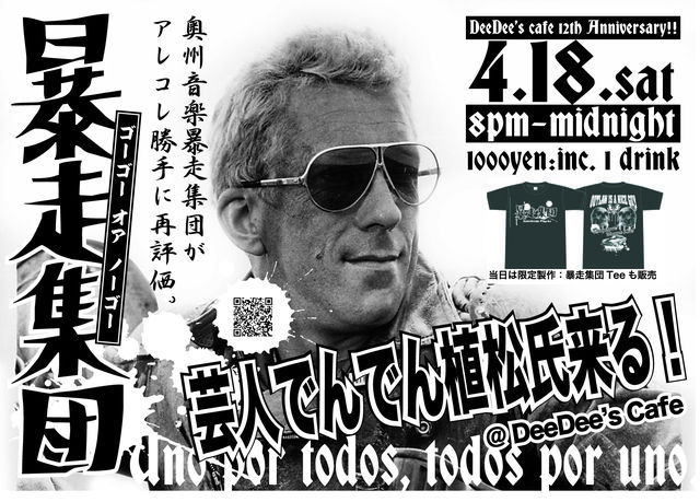 もう12周年を迎えたディーディーです。4/18にパーティ開催。 今年は蘇民祭に参加したメンバーの多くがスタッフとしてお手伝い。 そして、最後の争奪戦までご一緒した芸人の「でんでん植松氏」がゲスト! 【日時】2008.04.18(土) 20:00 〜 25:00 【料金】\1,000 (with 1Drink) ★懐メロ: 基本的に当店の選曲は和洋を問わず懐メロが多いのだが、 今年は“メロコア”や“ヘビメタ”を勝手に再評価して激プレイ! ★選曲家(予定): 毎度毎度の奥州アウトローズに加え…正直未定! ★スペシャル: 大都会からのゲスト。芸人「でんでん植
