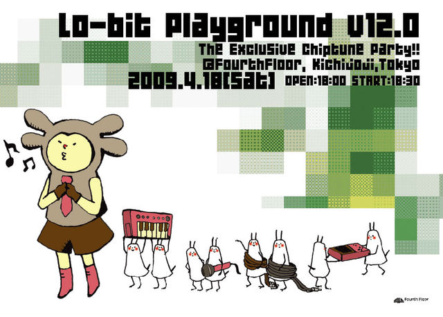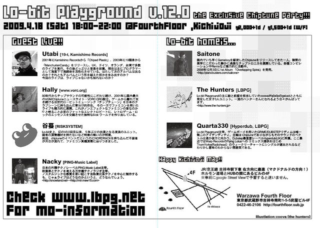 Lo-bit Playground v.12.0 2009.4.18(Sat.) Open 18:00 / Start:18:30 @吉祥寺Fourth Floor(http://fourthfloor.sub.jp) ¥2,000/1d さもなくば ¥1,500/1d[w/flyer] http://www.lbpg.net Guest Live ├ Utabi [19-t, Kamishimo Records] ├ Hally ├ 谷蟇 [RISKSYSTEM] └ Nacky [PING-Music Label] Lo-bit Homies ├ Saitone ├ The Hunters └ quarta330 とってもお久しぶりなロービットプレイグラウンドでございます。 今回はなんとステキな兄弟対決が実現しました!!パソコン通信でもおなじみのUtabiさんとHallyさん