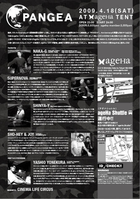 team☆最前列。のみなさんどうもぉ〜〜〜〜♪♪♪ お次のPANGEAの予定です♪ ディスカウント必要な方は直接メールください♪♪♪ ---PANGEA -The Landing ---------------------------------------------- 前回、5th Anniversaryから開催時間を深夜へと移し、今年から更なる進化と飛躍を担うべく再始動した"PANGEA"。 Anniversaryの興奮も冷めやらぬまま、今回はageha TENTに揺るぎない布陣で開催する。オープニングには"OCTAGON"のSHO- HEY+JOY、そして同じくOCTAGONから各方面から引っ張りだこの人気VJ・YASHIO YONEKURAがageha T
