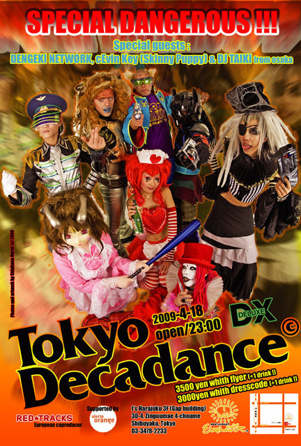 ▽▲▽:Tokyo Decadance DX special DANGEROUS!!:△▼△ 日時 4月18日(土曜日)23:00 OPEN 場所 ELephant cafe / HARAJUKU 住所 150-0001 東京都渋谷区神宮前4-30-4 t's原宿3F 電話 03-3478-2233 料金 door 4000yen, with flyer 3500yen, dress code* 3000yen 地図 http://www.mapion.co.jp/c/f?uc=1&grp=Air&nl=35/39/55.741&el=139/42/33.039&scl=10000&icon=home,,,,,&coco=35/39/5 5.741,139/42/33.039 ・‥━━☆:★・‥━━☆:★・‥━━☆:★・‥━━☆:★・‥━━☆:★・‥ 4月バカをぶっ飛ばせ!桜吹雪舞い散る春