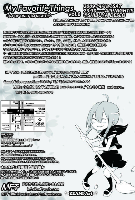 はい、春の到来です!みなさんは桜と言ったら何を思い浮かべますか?入学式?卒業式?新生活スタート? 僕は断然カードキャプターさくらですね!CLAMP最高!サクラ大戦はやったことありません! そんな感じで始まりました、アニソン、ゲーソン、同人、ニコ動、ボカロ、A-POPなら何でもありのパーティーナイト「My Favorite Things」です! 今回のLIVEは、秋葉原から萌えを発信するライブ&オタ芸イベントスペース、ディアステージより「うさぎのなみ平&夢眠ねむ」、ゲーム音楽を弾かせたら右にでるものはそうはいない、ニコ動でも大人気のキー