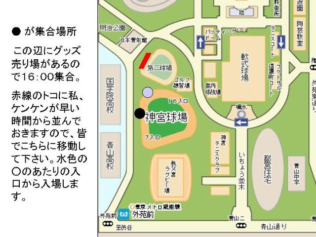 集合場所と時間をアップしました ↑ ↑ ↑ 16時にレフト側のグッズ売り場近辺に集合です。 副管理人、Akkyさんが目印になります。 前日くらいにAkkyさんから目印のメッセを送ってもらいます。 そして、ケンケンが並んでるトコまで移動し、皆で入場します。 少人数で何席もキープするのはマナー違反なので、 可能な方はできるだけ遅刻せずに来て下さい。 遅刻の方は席が決まったら場所をアップするので適当に探して下さい。 ちなみに、遅刻の方はケンケン宛てに「場所が分からん」って メッセ送っても気付かない確率が激高なのでご注意下