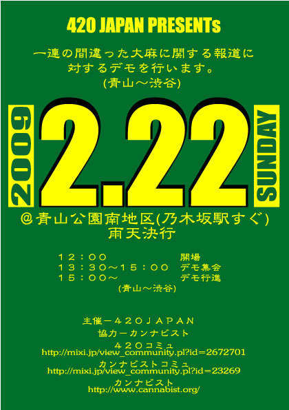 2・22 SUN@青山公園南地区(乃木坂駅すぐ) 12:00−開場 13:30〜15:00−デモ集会 15:00〜 デモ行進 青山〜渋谷 主催−420JAPAN 協力−カンナビスト 角界大麻汚染に始まり、芸能界やスポーツ界、全国の大学生にまで飛び火した一連の大麻報道。 その多くは正しい情報をひた隠しにして、間違った情報ばかりを流し、国民を洗脳し続けています。 何故大麻は悪い物なのか? 「法律で悪いと決まっているから」、 「昔から大麻は他の薬物と同じ様に危険な物だと教育され