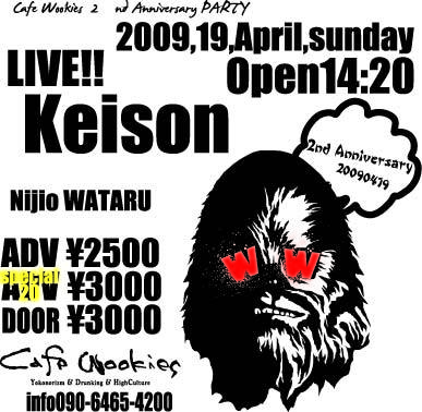 KEISON Live!! 4.19 sun CafeWookies2'nd Anniversary Partyのお知らせです。 4月19日 日曜日 Open 14:00 CafeWookies2'nd Anniversary Partyを開催します。 ADV\2500 specialADV\3000 Door\3000 いずれもDrink別 Live!! Keison http://mixi.jp/view_community.pl?id=107154 虹尾ワタル and more......... Dj Wookies DJ crew and more........ Wookiesから一言 CafeWookiesは2009年4月19日で2周年を迎えます。 これも普段からCafeWookiesを支えていただいているみなさ