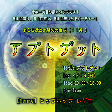 2009年も早くも4月に突入しました〜!! そこで管理人さま告知失礼します。 相応しくなかったら面倒ですが削除お願いします。 バスタクラン初の野外ダンス 足立区 北千住 荒川河川敷 Day:4/19(日) Time:10:00〜18:00 Fee:free 【Genre】 ヒップホップ レゲエ 自由に踊り、自由に笑い、自由に楽しめるパーティー! まさに緑と太陽の光合成(!!笑 ) 詳しくは http://mixi.jp/view_bbs.pl?id=40709387&comm_id=3548728 土手でのゲリライベントですが気持ちいいと思いますので興味があったら気楽にご
