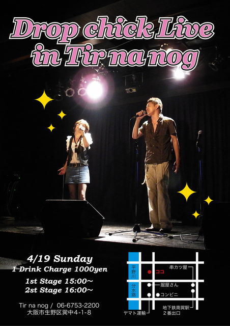 ああ・・・随分久しぶりだことw 皆様、お元気ですか? この度、実に2年ぶりくらいにTir Na Nog店内でカフェライヴをしようとおもいまして。。。 もっと早くに告知しようと思いましたがなかなかドタバタしており後手に回してしまいました(泣) ってことで、4月19日(日)、Tir na nogで「Drop Chick」、久々にライヴします。 洋楽ヒットソング中心に繰り広げる笑いアリ、感動アリのステージをお楽しみくださいwww もちろん大の洋楽フリークでいらっしゃる「のぐ」様も子連れでいらっしゃいます!! 多分店内は