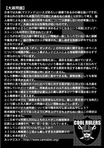2・22 SUN@青山公園南地区(乃木坂駅すぐ) 12:00−開場 13:30〜15:00−デモ集会 15:00〜 デモ行進 青山〜渋谷 主催−420JAPAN 協力−カンナビスト 角界大麻汚染に始まり、芸能界やスポーツ界、全国の大学生にまで飛び火した一連の大麻報道。 その多くは正しい情報をひた隠しにして、間違った情報ばかりを流し、国民を洗脳し続けています。 何故大麻は悪い物なのか? 「法律で悪いと決まっているから」、 「昔から大麻は他の薬物と同じ様に危険な物だと教育さ