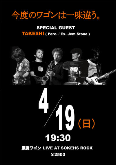 前日の長野ツアーから東京に戻って連戦! ホームグラウンド、SOKEHS ROCKでのワンマンライブです。 長野でのライブに引き続き、今回もゲストにパーカッションの TAKESHI(小川岳史)さんを迎えてのスペシャルライブ。 超Sexyな生R&Bバンド「Jem Stone」 のドラマーであり、 キューバ仕込みの強力なコンガプレーヤーでもあります。 http://www.jemstone.jp/ 彼の参加で、よりスリリングなパフォーマンスを お楽しみいただけること間違いなしです! 今回はホーンセクションはお休みですが・・・飛び入りはあるかも! 前売り等はござい