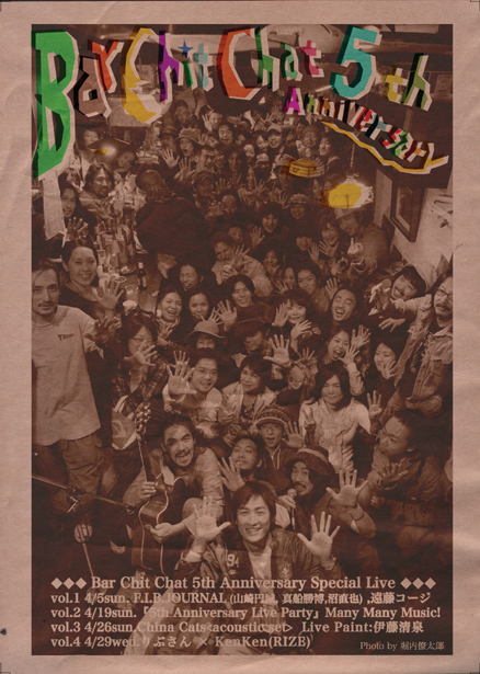 書き込み失礼します Bar Chit Chatがもう5歳になります! 今年もイカしたヤツらとお祭りやります! 絶対来てくださいね! Bar Chit Chat 5周年を迎えるにあたって ボクがBarを突然始めると言いだした時,賛成してくれたのはほんの2,3人でした。 それもそのハズ,ボクはお店をやろうと生きて来た人間では決してなかったから。 誰もが1年と保たないだろうと思っていたようです。あの時,心から賛成してくれた 人達どうもアリガトウ。おかげで100%駄目って訳じゃあないんだなって思えたよ。 3%も可能性があればなんとかなるって思えまし