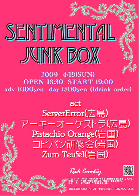 勢いのある楽曲を繰り出すバンド+αな内容で送る充実イベント とにかく楽しみ方は自由!ストレスたまってる人寄っといでー! act ☆ServerError(広島) ☆アーキーオーケストラ(広島) ☆Pistachio Orange(岩国) ☆Zum Teufel(岩国) ☆コピバン研修会(岩国) 前売 1000円 当日 1500円 (1ドリンク別)