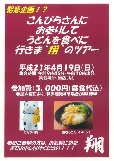 このたび、日ごろのみなさまへの感謝の気持ちをこめまして、日帰り旅行を企画しました みなさまお誘い合わせのうえ、ぜひともご参加いただけますよう、ご案内いたします 日時 平成21年4月19日(日) 『翔』集合 9時45分集合、10時出発 参加費 3,000円(交通費、昼食代込) (参加人数により、多少前後する場合があります。) 当日は『こんぴらさんへのお参り』、『うどんを食べる』こと以外は、特に決めておりません 時間の許す限り、行き当たりばったりで、あちこち立ち寄っ