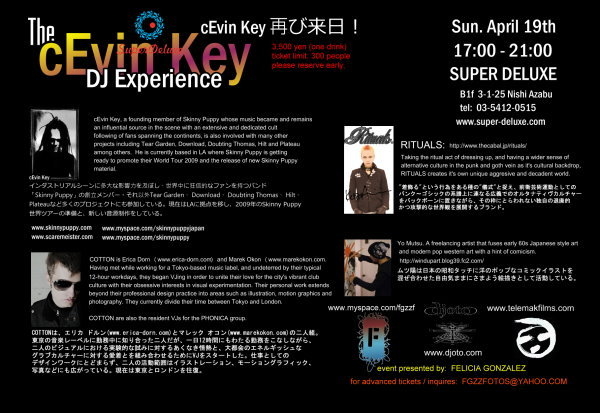 NEW SKINNY PUPPY 2009 SNEAK PREVIEW !!!! 開催日時:4月19日(日) 17:00〜21:00 会場:SUPER DELUXE URL www.super-deluxe.com 携帯用 www.sdlx.jp HIP PARTY 今春のコラボ:ミュージック・アート・ファッション・メディア... ケビン・キー再び東京に現る!! スキニー・パピーのニューアルバムから新譜をスペシャル・プレビューでスピン! NEW ダウンロード、ティア・ガーデン、スケアマイスター、プラトーや Subconscious Beyond the VAULT シリーズ 2009より新人アーティストなど(DJオトも含