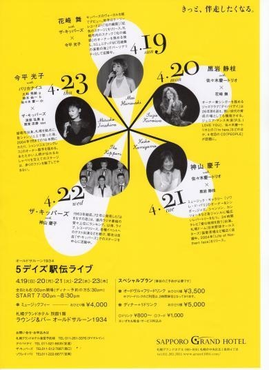 札幌市中央区のグランドホテルでお逢いしましょう。5デイズ駅伝ライブ この企画でしか聴けないデュエットをたすきに、5日間をつなぐ駅伝ライブ♪ 是非、ご予約のうえ、ご来場下さいますよう、 メンバー、スタッフ一同、張切ってお待ち申し上げます 4/19(日) 花崎 舞 with ザ・キッパーズ ゲスト : 今平 光子 4/20月) 黒岩 静枝 with 佐々木慶一トリオ ゲスト : 花崎 舞 4/21(火) 神山 慶子 with 佐々木慶一トリオ