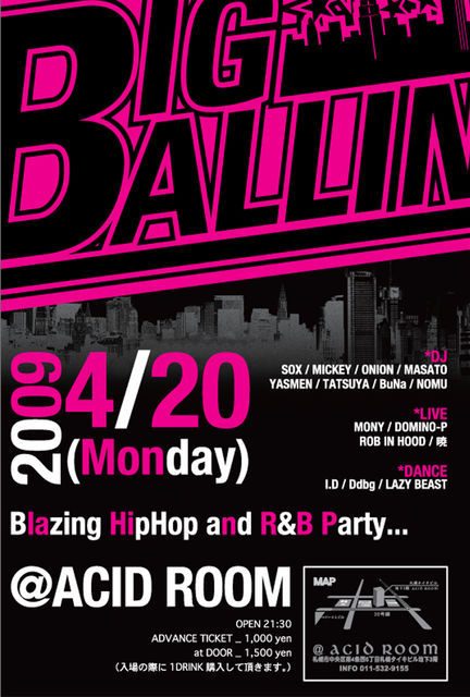 ACID ROOMで4月からスタートするHIP HOP, R&B PARTY! "BIG BALLIN"!!! 週末のPARTYを盛り上げているメンツが集結し、第3月曜日のACID ROOMをガッチリLOCKしちゃいますよ〜! 週末は忙しくてちょっと...なんて人から、平日も遊びたい!って人までみんなで酔っぱらって騒いじゃいましょう〜! そして"BIG BALLIN"では遊びにきてくれたみなさんにMIX CDをプレゼント! 現在CLUBで盛り上がっている曲から、HIPHOP CLASSICS、そして"BIG BALLIN"に出演するアーティストの音源をDJ MASATOがMIX! 今回はJ.S.C、DOMINO-P、MONY 13の曲を収録