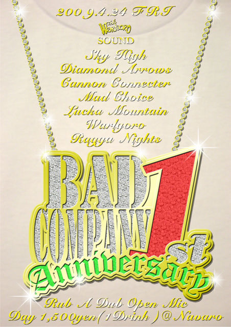 Hey! BadMan&BadWoman. Respect!! WALGORO presents BAD COMPANY 1st Annibersary. そんな記念すべき6回目のWBC Dance.特別熱い夜になる事間違いなし! 遊びに来てHigh!yo!! -------------------------------------------------------------------------------------- WARLGORO presents BAD CANPANY 1st Annibersary 2009/4/24 FRIDAY @NABARO(銀座通り3号線寄り、au隣) DAY: 1.500-yen(1D) open/start 23:00 START sound SKY HIGH DIAMOND ARROWS CANNON CONNECTER MAD CHOICE LUCKA MOUNTAIN WARLGORO rnt