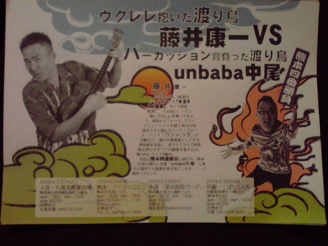 管理人さん、コミュ参加のみなさん、こんばんは! うんばば中尾さんとウクレレ弾き・藤井康一さんライブのお知らせです☆ 昨年、うんばば中尾さんの生誕20周年ライブでも 共演されてました 抱腹絶倒まちがいなしのライブ ぜひお誘い合わせの上お越しください^^ 会場が狭いので予約制とさせていただきます。 お早めにご連絡くださいね☆ ■ウクレレ抱いた渡り鳥 +パーカッションを背負った渡り鳥 藤井康一 + うんばば中尾ライブ 4月24日(金) open 18:30 start 19:0