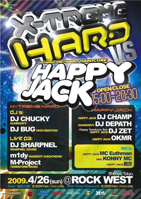 東京を代表するハードコアイベント『X-TREME HARD』と『HAPPY JACK』昨年10月のファースト・インパクトから早半年、お互いの意地とプライドを賭けた東京ハードコア頂上決戦第2ラウンドが開催決定!! 場所は『HAPPY JACK』のホーム、渋谷ROCK WEST!ゴングは4月26日15時!その時、あなたは歴史の証人となる!