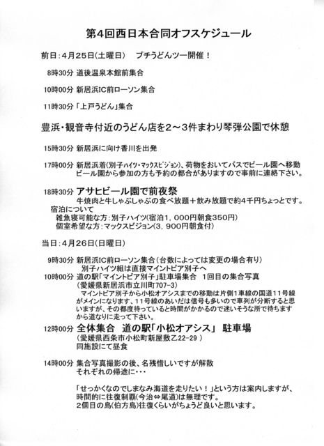 25日が雨予報(確立70%・・・)のため26日のみの開催とします! 26日のスケジュールは変更無し 9:30新居浜ICまえローソン集合 10:00マイントピア別子 12:00小松オアシス 14:00解散 で行きます。 再度参加の有無を書き込みお願いしますm(_ _)m 皆さんこんにちは、四国こまじぇ会のめだかです。 いささか気が早いですが、告知させてください 「第4回西日本合同オフ」を4月25・26日に以下の要領で開催します。 今年は25日を前夜祭・26日を本番としますので注意して下さい。