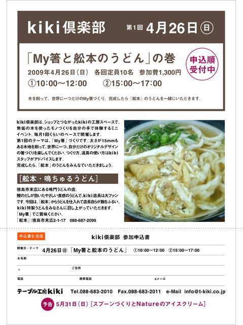 あの『テーブル工房kiki』さんで http://www.t-kiki.co.jp/index.html なんと世界でひとつだけのお箸つくりを楽しめます 完成したらみんなでうどんを食べましょう テーブル工房kikiさんを大好きな佐藤からのお知らせでした。