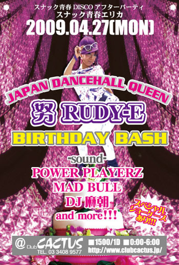 告知失礼致します!!!!! 4/27(月曜日)は努のRUDY-E=JAPAN DANCE HALL QUEENのBIRTHDAY BASHを乃木坂Club CACTUSで開催するので皆さんお祝いに来て下さいねー♪ 『スナック青春エリカ』 OPEN AM24:00〜AM6:00 1500/1drink SOUND >POWER PLAYERZ >MAD BULL >DJ 麻朝 and more!!!! Special Show Caseありますよー☆ 皆で飲めないRUDY-Eにここぞとばかりに飲ませ魔SHOW!!!! PM18:00〜PM23:30までは『スナック青春DISCO』OPENしています!! CACTUSが昭和真っただ中ですよ!
