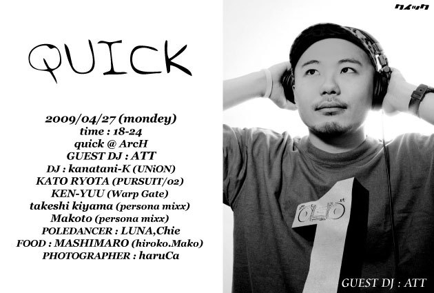 管理人様告知失礼致します。 不適切であれば消去お願い致します。 新宿2丁目のクラブ、club ArcH で毎月第4月曜日に開催されているアフタヌーンパーティー(18時-24時)『クイック』。 2007年4月からスタートし、普段新宿2丁目に来る機会がない方、興味がある方、もちろん定期的に遊びに来る方に楽しんでいただける内容を提供する事をコンセプトに、毎回国内外で活躍するゲストを招いて開催。また2008年8月にはKAGAMI, MOA(CARIZMA), ABEBEレジデントの『DISCOrDANCE』とのコラボレーション、2008年12月にはYO*Cレジデントの『UNiON』とのコラボレ
