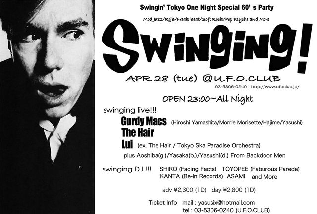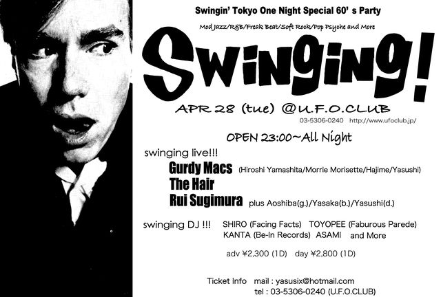 『Swinging!』〜 swinging tokyo one night special 60s party 〜 Mod Jazz/R&B/Freak Beat/Soft Rock/Pop Psyche and More! 4/28(tue) @東高円寺U.F.O.CLUB 03-5306-0240 http://www.ufoclub.jp/ OPEN 23:00〜All Night ☆LIVE  LUI (Backing Member:Aoshiba, Yasaka, Yasushi from “Backdoor Men” )  The Hair  Gurdy Macs   ・山下洋 (Wack Wack Rhythm Band)   ・Hajime (Faburous Parade)   ・Morrie Morisette (Fabulous Parade)   ・鈴木やすし (Backdoor Men)   ☆DJ   SHIRO (F