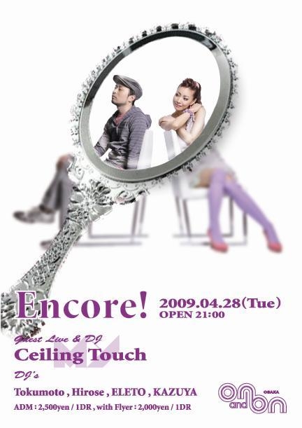 管理人様告知失礼致します。 本日、Dee-kayさんがシークレットとして出て頂けます。しかも、新ユニットDJ MAYさんとのコラボです!!!!!!!! 是非ともこの機会を見逃さずに遊びに来て下さい!!!! ゲストで入れますので気軽にメッセージ下さい!!!Liveは12時くらいからです。 詳細は↓ いよいよ来週にEncore!迫ってきました。 今回で4回目!!!! Vol.4のGuestとして迎えるのは Ceiling Touchです!!!!!!!!!!! Liveもありの豪華セットでお送りします。 ユキジャの声に酔いしれてください!!!!!! しかもシークレットLiveもあります