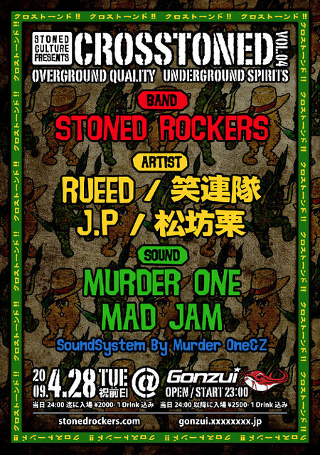 ついにvol.4となるCrosstoned。今回は3/6のドラゴンクラブリリパも満員御礼大好評だったRueedを筆頭に、去年の12月に"feel the R"で茅ヶ崎RikiRikiDeliを爆笑の渦に巻き込んだスーパーカルテット笑連隊、葉山地域代表JP,ゴンズイ代表松坊栗を迎えさらに激しく辻堂の夜を揺らす。サウンドはもちろん、MurderOne,そしてMadJam。毎回ソールドアウトのこのスーパーイベント、今回は先着100名様まで。ゴンズイで電話予約できるから、今すぐゲット!!