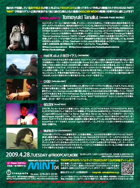 4/28(火・祝前日)は神戸のTroop CafeにてDJします! 今年初となる神戸でのDJ、どうぞお見逃し無く! 『MINT #4』 ■2009/4/28(火・祝前日)  open/start 22:00〜 ■会場  神戸Troop Cafe  神戸市中央区北長狭通2-11-5 グランドコーストビル B1F  TEL: 078-321-3130  http://www.troopcafe.com  troopcafe@nifty.com   ■GUEST DJ:  Tomoyuki Tanaka(Fantastic Plastic Machine) ■DJ:  mad IK a.k.a 小坂田イタル(RAZONATION)  CHOO(Reflection)  DJ GOLDEN(blume*/GOLD)  MuRAc0(La Luna/GOLDFLASH)