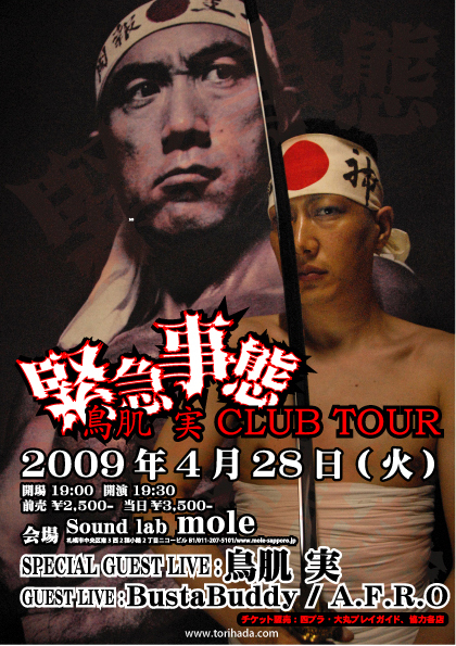 あの鳥肌 実 先生が今回はクラブでライブしますよ 皆さんは知っているとは思いますが、 クラブでのライブは、講演会では見ることの出来ない過激さと 激しさが体感できますよ ライブ時間もたっぷりあるので、 危険な鳥肌 実 を体験してください げっそりげっそりげっそりげっそりげっそり ■緊急事態 鳥肌 実 CLUB TOUR 2009年4月28日 火曜日 開場 19:00 開演 19:30 前売 2500円  当日 3500円 会場 Sound Lab Mole  (札幌市中央区南3西2狸小路2丁目ニコービ