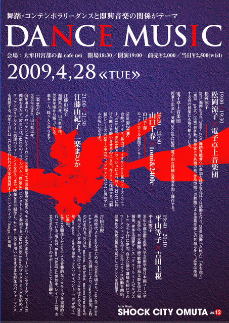 管理人さま、告知失礼します! ----------------------------- cafe nei×SCO第2弾! 「DANCE MUSIC」 4人の踊り手と4つの即興演奏のコラボレーションです。 会場:大牟田宮部の森 cafe nei 開場18:30/開演19:00 前売¥2,000/当日¥2,500(w1d) info:scomuta@gmail.com 松岡涼子×電子卓上音楽団 平山等子×吉田主税 山口千春×tomi&2400c 江藤由紀子×一楽まどか ■江藤由紀子 福岡県出身、山口県在住。 2006年頃から踊っている。 基本一人。 時々人とやります。 ■一楽まどか 1987年生まれ。山口県出身。