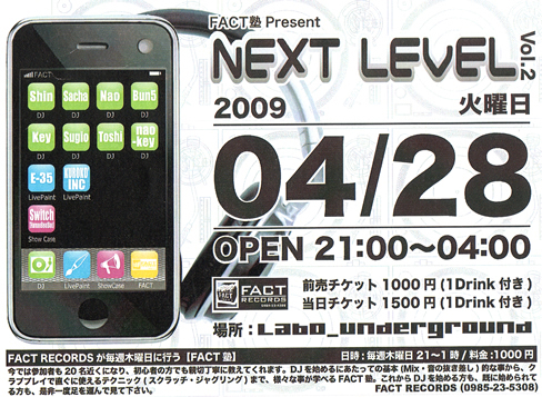 管理人様告知失礼いたします。 もし不適切でしたら、お手数ですが削除お願いします。 ----------------------------------------------------------- ┏┏┏                          ┏┏   [FACT 塾]Presents -【Next Level Vol.2】 - @Labo_Underground ┏               宮崎のアンダー・グラウンド・シーンを牽引するレコード・ショップFact Recordsで、毎週木曜日に開催されている超実戦型DJスクール[FACT 塾]! 今では参加者も20名近くになり、そこに通う塾生のスキルも、そ