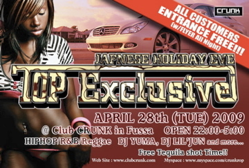管理人様、告知失礼します。 今週祝日前はDJ YUMAを迎えて福生CRUNKを盛り上げちゃいまするんるん フライヤー持参でALL NIGHT入場無料なんでフライヤー無い方はメッセージ下さいね〜exclamation ×2 ☆☆Top Exclusive☆☆ ☆4/28 (火) @福生Club CRUNK ☆Open :22;00~ ☆Entrance :1.500yen /1d ☆DJs : YUMA .LIL JUN .TAKUMI ☆フライヤー持参でALL NIGHT入場無料!! ☆DJ YUMA -Ride-コミュ http://mixi.jp/view_community.pl?id=1046274 ☆DJ YUMA WEB SHOP http://shop.djyuma.com/ ☆CRUNK HP http:/