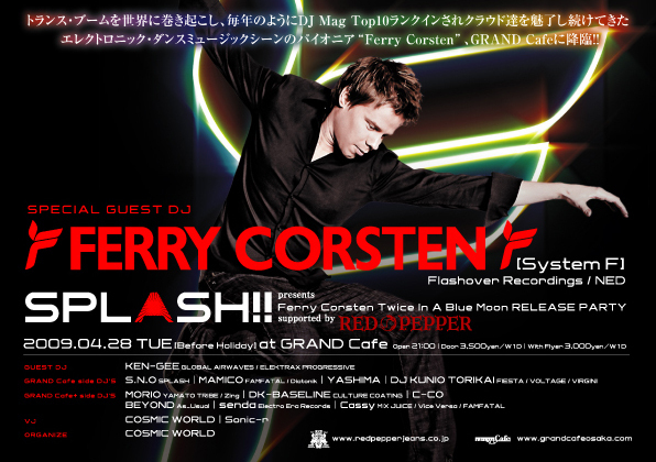 SPLASH@大阪GRAND Cafe ヘッドフォン4/28 大阪でGlobal Airwaves主宰のKEN-GEEがFerry Corstenと共演!!ヘッドフォン 2009年4月28日、GRAND CafeにてCOSMIC WORLDがオーガナイズする良質のトランス・プログレッシヴハウス・テック ハウスをお届けするNEW PARTY「SPLASH」が始動!! 記念すべき第一回のメインアクトはトランス・ブームを世界に巻き起こしたFerry Corsten(System F)! クラブシーンにその名を轟かせたSystem F名義でのリリース'Out of the blue'をはじめ、'Gouryella', 'Punk' 'Rock Your Body, Rock' 'Fire' 'Beautiful'などヒッ