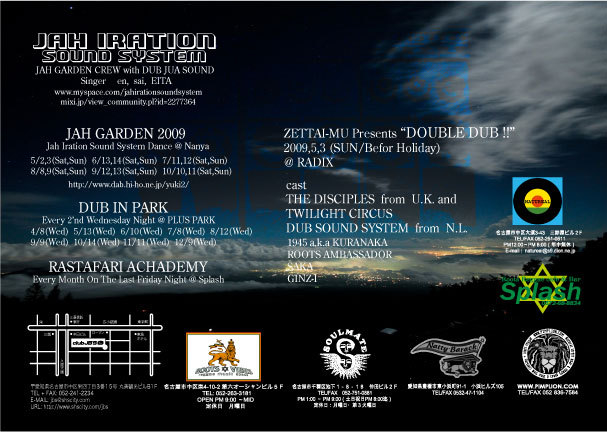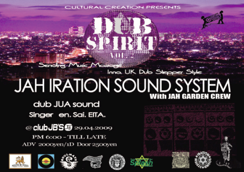 DUB SPIRIT vol.2 @club JB'S 2009.04.29(wed)祝日 pm6:00 start ADV:2000yen/1D DOOR:2500yen sending music massage inna UK Dub Stepper Style ☆JAH IRATION SOUND SYSTEM☆ with JAH GARDEN CREW DUB JUA SOUND [singer] en Sai special THANKS! ・ROOTS VIBES ・NATUREAL ・SOUL MATE ・NATTY BARACK ・PIMP LION ・SPLASH 今年のJAH IRATION SOUND SYSTEM初出しで印象深い【CLUB JB'S】にてDUB SPIRIT come again!! ゴールデンウィーク真っ只中の祭日です!みな